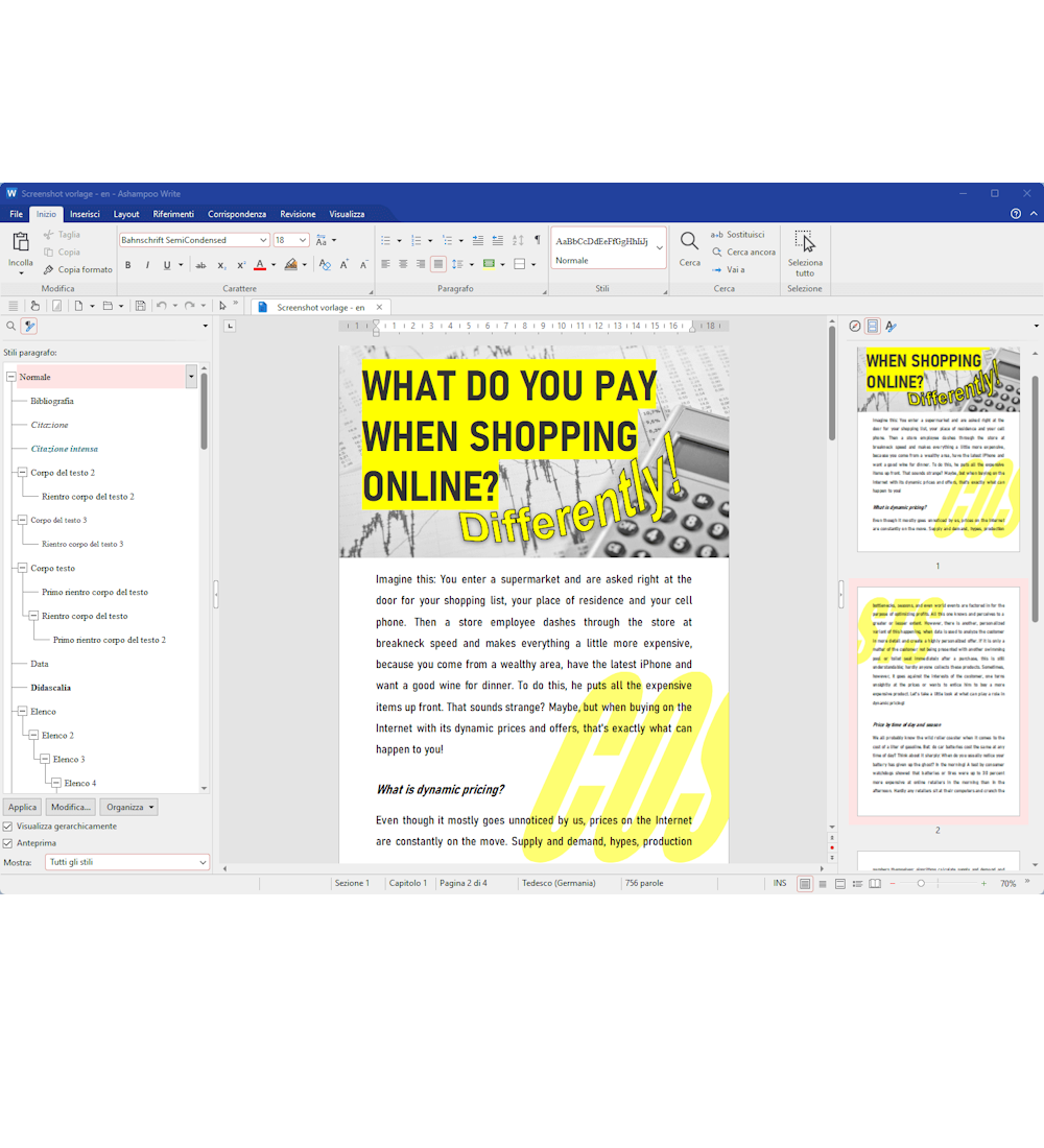La nostra alternativa a Microsoft Word offre una vasta gamma di nuove opzioni: confronta due documenti fianco a fianco con lo scorrimento sincrono, seleziona più intervalli di testo non contigui con il tasto Ctrl e beneficia del monitoraggio avanzato delle modifiche ai documenti! Crea documenti con caratteri incorporati che assicurano ai tuoi lettori un'esperienza completa anche se non li hanno installati! Il nuovo layout del libro mostra la prima pagina di un documento sulla destra nella vista a due pagine, le celle della tabella ora possono essere facilmente ruotate e la numerazione degli elenchi ora supporta l'allineamento a destra. I testi fittizi possono essere creati istantaneamente e gli stili di paragrafo e carattere sono ora facilmente filtrabili. La migliore alternativa a Word è appena stata migliorata, quindi cosa stai aspettando?