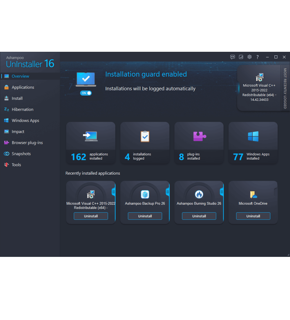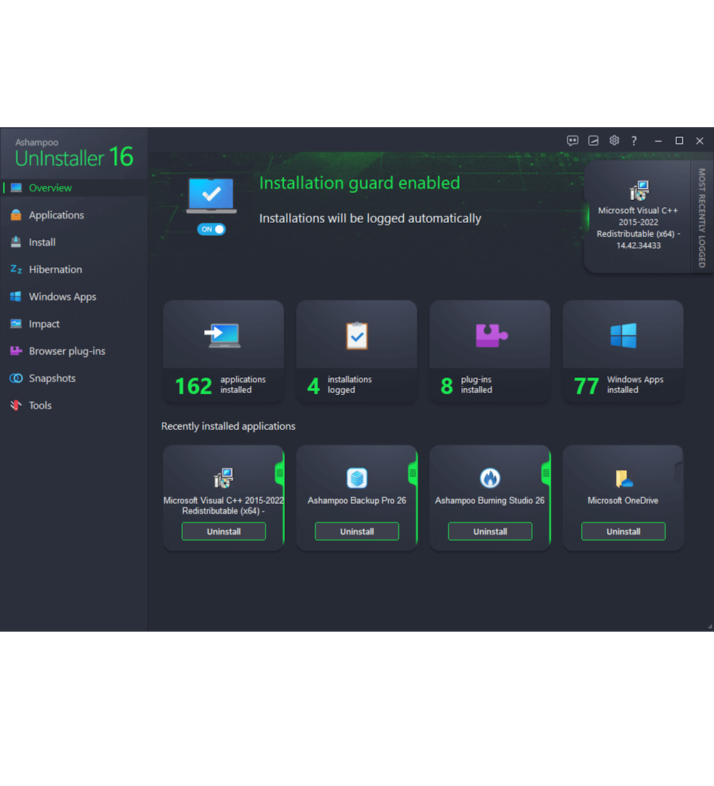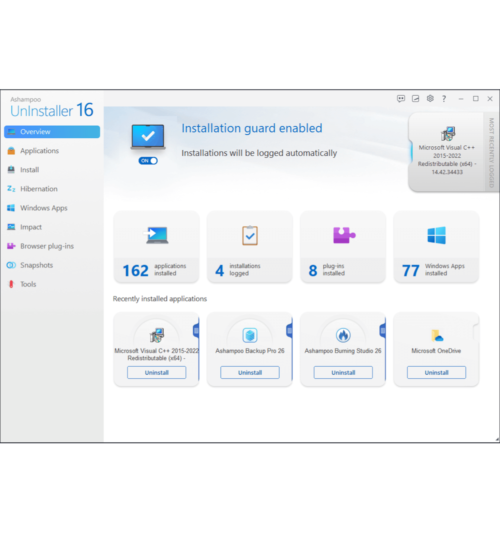 Ashampoo UnInstaller 16 ora funziona in modo ancora più efficiente! Con un utilizzo della memoria e della CPU significativamente ridotto, il tuo sistema funziona in modo più fluido mentre trai vantaggio dalla creazione e dall'elaborazione ottimizzate dei registri. Anche con i sistemi più vecchi o più deboli, l’analisi in tempo reale ora è un gioco da ragazzi! Inoltre, i confronti accelerati delle istantanee ti consentono di tenere traccia dei cambiamenti tra due stati in pochissimo tempo.