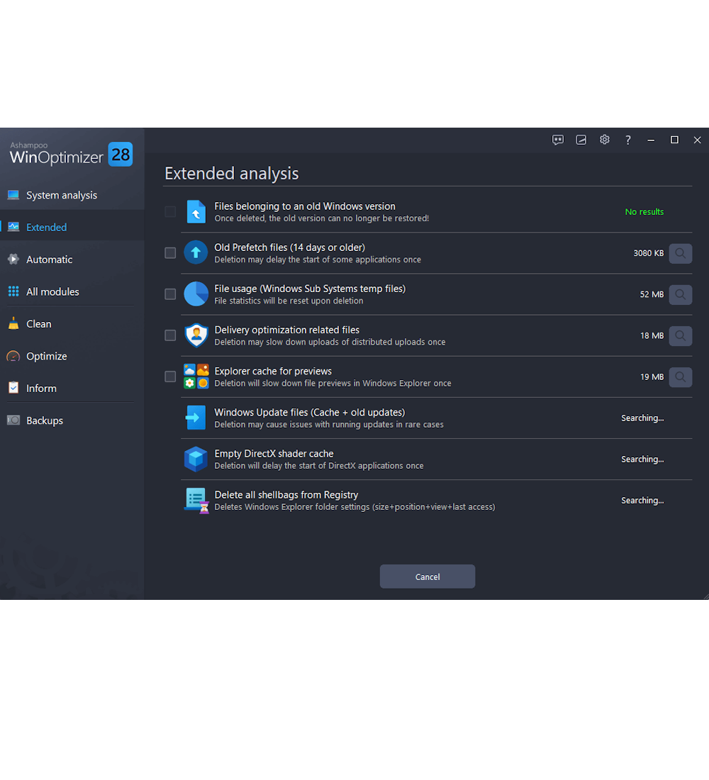 Con la nuova ed estesa pulizia approfondita, la caccia ai file spazzatura entra in una nuova fase e ora anche i problemi di privacy e visualizzazione sono facilmente risolvibili! Sbarazzati delle vecchie versioni di Windows, dei backup degli aggiornamenti di Windows e delle statistiche sull'utilizzo di Windows. Risolvi i problemi di visualizzazione nei tuoi giochi svuotando la cache dello shader DirectX e velocizza il tuo lento Esplora risorse cancellando la cache dell'anteprima. Potrai anche recuperare un sacco di spazio su disco rigido durante il processo.