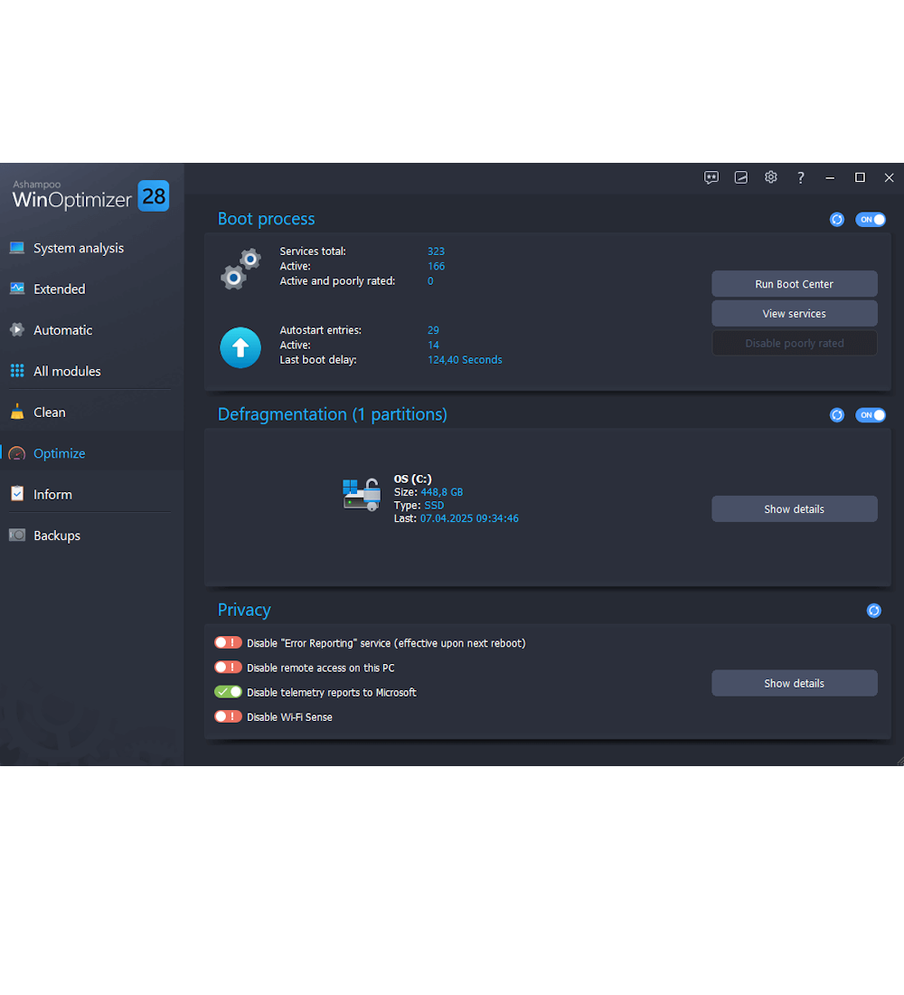 Con il nuovo Ashampoo WinOptimizer 28, ottieni automaticamente la migliore esperienza Windows. La sua nuova automazione accelera, pulisce e ottimizza le tue applicazioni. Fai in modo che il tuo PC si adatti perfettamente alle tue esigenze con l'assegnazione delle priorità ai processi, la pulizia automatica dei file temporanei e le configurazioni dei profili personalizzati basate sul nuovo Profile Booster. Che si tratti di giocare, lavorare o navigare, massimizza le prestazioni del tuo sistema o risparmia risorse, la scelta è tua. Il nuovo Crash Analyser offre approfondimenti sui crash del sistema e sulle relative cause, mentre quattro strumenti di pulizia avanzati garantiscono la privacy e forniscono la manutenzione del sistema. Grazie alla migliore gestione della memoria, WinOptimizer può ora utilizzare più risorse per eseguire analisi complete quasi istantaneamente!