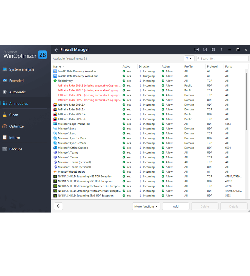 Sai quali app hanno accesso a internet? Vuoi sapere cosa c'è in entrata e in uscita e quali regole potrebbero essere obsolete? Con il nuovo Firewall Manager, puoi controllare completamente il tuo traffico di rete. Identifica facilmente cosa è consentito e dove potresti dover intervenire. Con le modalità base, standard e avanzata, i filtri intelligenti e un filtro per la ricerca di regole disattivate o errate, saprai rapidamente quali app possono inviare o ricevere dati e potrai decidere cosa consentire o bloccare. Riprendi il controllo del traffico del tuo PC con pochi clic.
