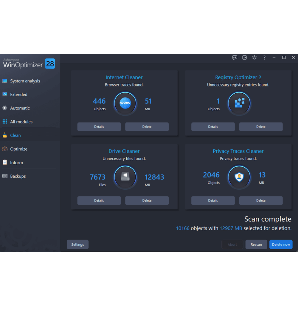 Gli addetti alle pulizie di fiducia sono stati continuamente migliorati, ora dotati di nuovissimi algoritmi di ricerca per capacità di pulizia ancora più potenti. Si concentrano sulla rimozione non solo del disordine, delle tracce di navigazione e degli elementi di registro non necessari, ma pongono anche una maggiore enfasi sui dati sensibili. Con Privacy Traces Cleaner, ottengono una protezione della privacy senza precedenti. Anche trovare ed eliminare cartelle vuote ora è semplicissimo. Naturalmente i pulitori sono ottimizzati per tutti i sistemi operativi supportati, gli aggiornamenti attuali e tutti i browser comuni.