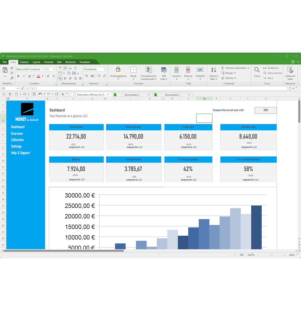 Creare calcoli e grafici complessi nei fogli di calcolo può essere una seccatura: Calculate di Ashampoo Office 9 lo rende divertente e coinvolgente. Dai semplici orari alla complessa documentazione finanziaria aziendale, Calculate è un sostituto di Excel con tutte le funzionalità e nessuna incoerenza. È dotato di evidenziazione istantanea della sintassi e convalida della formula per aiutarti a individuare gli errori in pochi secondi. Con oltre 350 calcoli, una facile gestione delle tabelle e il supporto per fogli dati giganti con milioni di voci, Calculate 9 è l'ideale per qualsiasi attività di fogli di calcolo. Funzionalità di livello professionale, come le tabelle pivot, soddisferanno anche gli utenti più avanzati. E le stampe dei fogli di calcolo finiti sono eccezionalmente facili da preparare, grazie alla nuova anteprima dell'interruzione di pagina. Calculate 9 utilizza il formato di file XLSX, lo stesso formato utilizzato da Microsoft Excel!