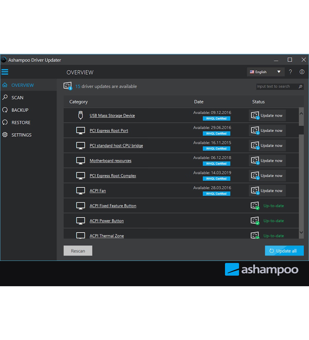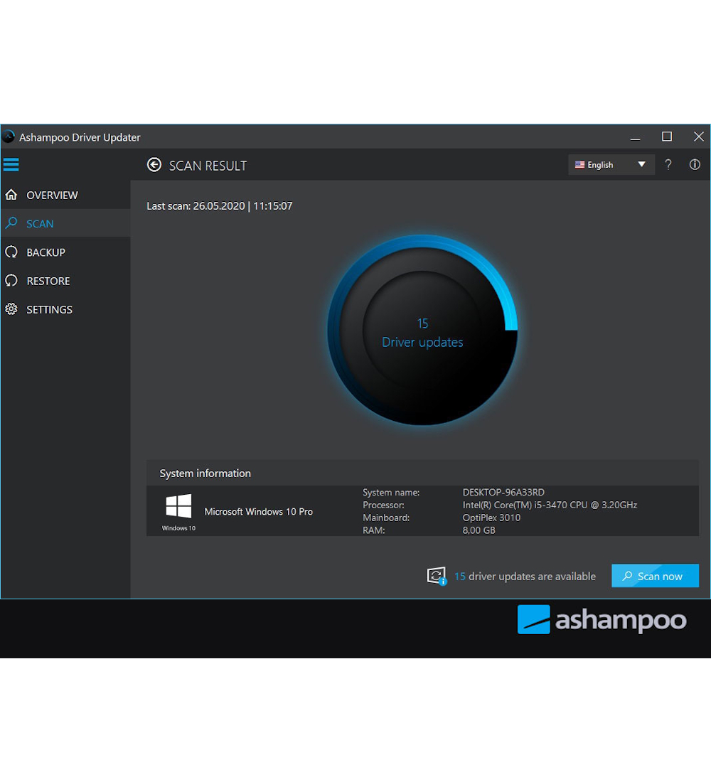 I driver vecchi o sbagliati sono il nemico di ogni sistema di computer. Spesso, i driver sono mancanti o irrimediabilmente obsoleti. Ashampoo Driver Updater non solo trova i driver migliori ma anche li installa per te.