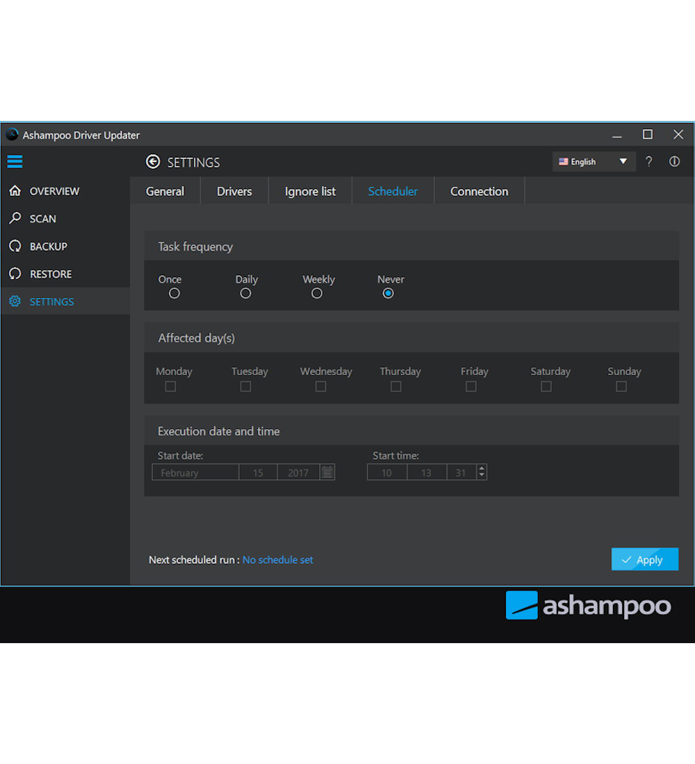 Decidi tu quando Ashampoo Driver Updater dovrà passare in azione. Il pianificatore integrato ti consente un controllo affidabile su quando il programma deve eseguire la scansione del sistema per gli aggiornamenti. Una volta impostato, non devi sprecare altri pensieri su di esso e il tuo sistema rimarrà aggiornato, sempre!