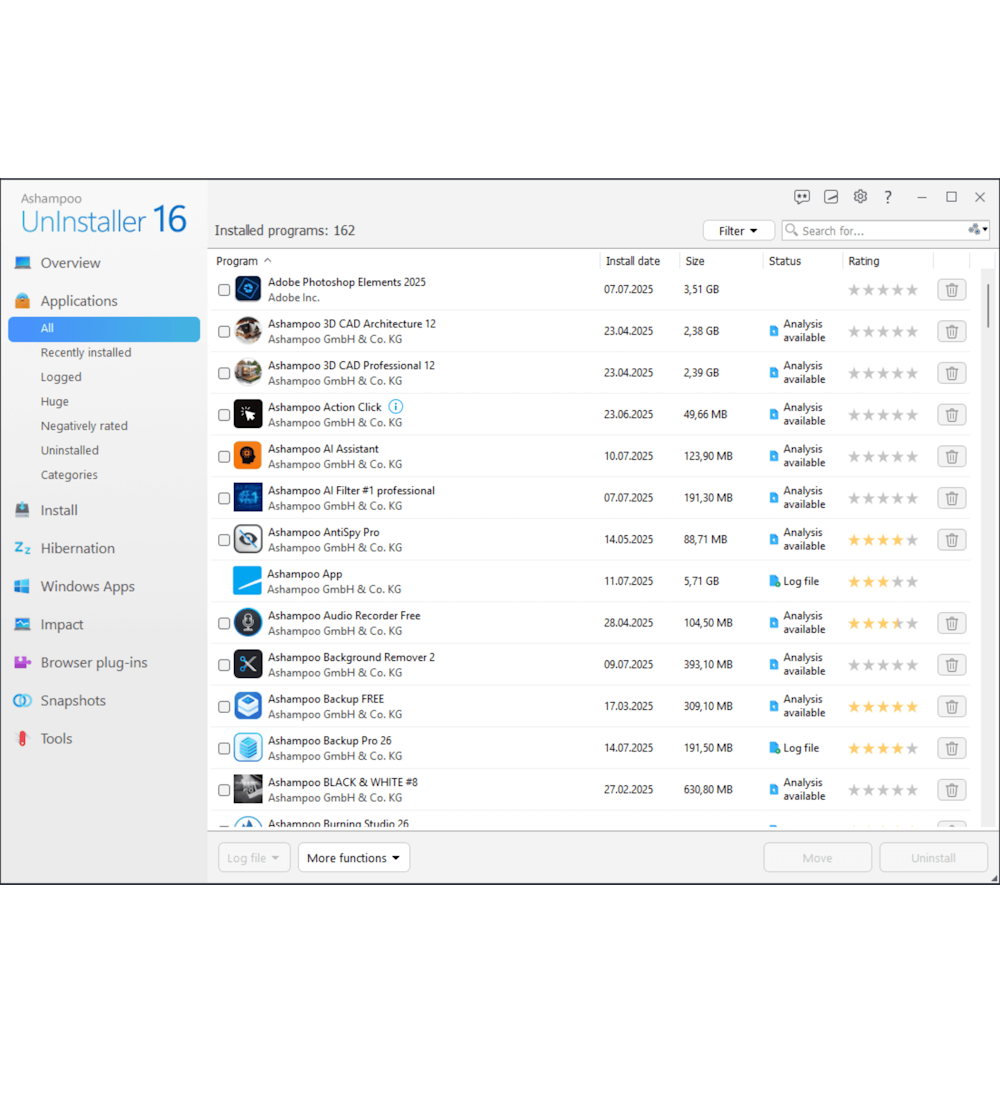 Oltre a Registry Optimizer, i moduli di pulizia sono stati riprogettati per prestazioni più veloci del 25-50%. Noterai la differenza anche durante la pulizia profonda, dove velocità ed efficienza sono ineguagliabili rispetto a qualsiasi altro programma di disinstallazione! I log di installazione possono ora essere esportati in formato HTML, CSV e TXT, rendendoli facili da usare in altre applicazioni o per ulteriori analisi. E se ti stai chiedendo perché Ashampoo UnInstaller 16 sia più veloce, abbia un aspetto più fluido o semplicemente funzioni in modo impeccabile: abbiamo apportato innumerevoli miglioramenti sotto il cofano!