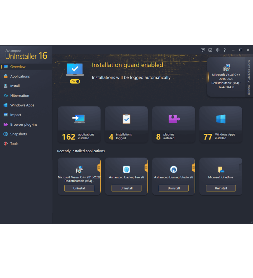 Ashampoo UnInstaller 16 ora funziona in modo ancora più efficiente! Con un utilizzo della memoria e della CPU significativamente ridotto, il tuo sistema funziona in modo più fluido mentre trai vantaggio dalla creazione e dall'elaborazione ottimizzate dei registri. Anche con i sistemi più vecchi o più deboli, l’analisi in tempo reale ora è un gioco da ragazzi! Inoltre, i confronti accelerati delle istantanee ti consentono di tenere traccia dei cambiamenti tra due stati in pochissimo tempo.