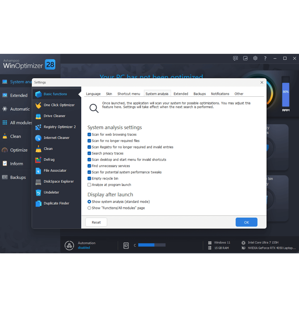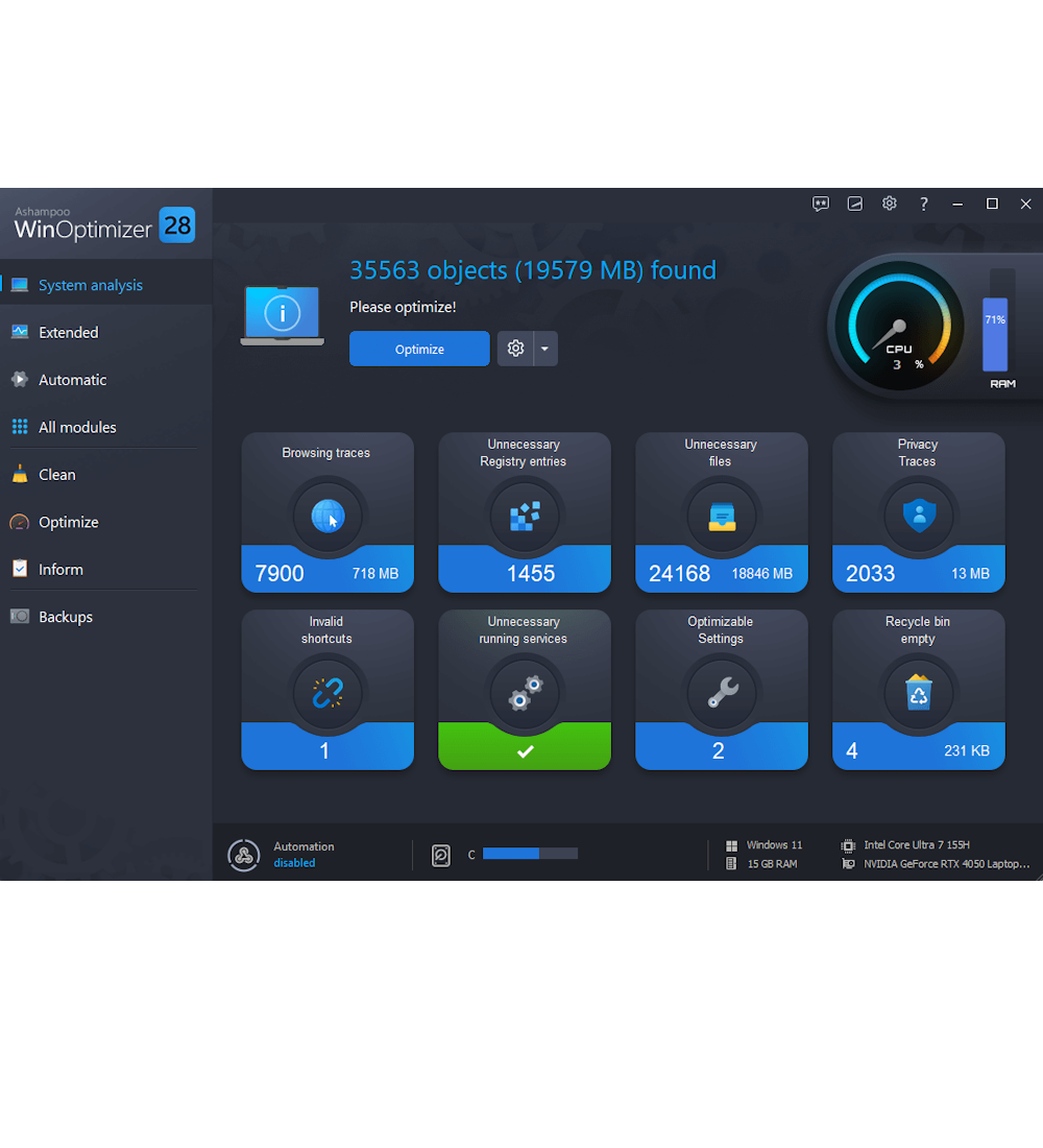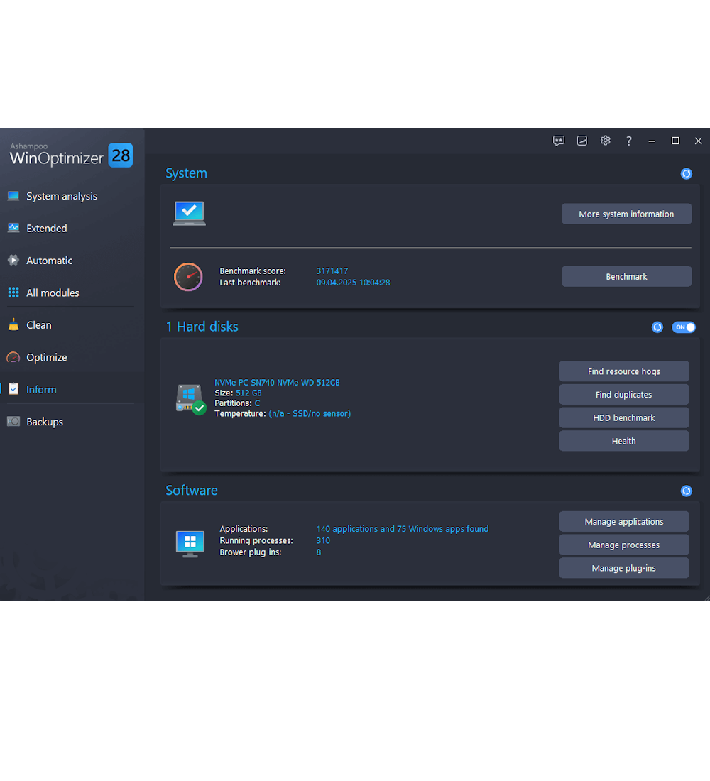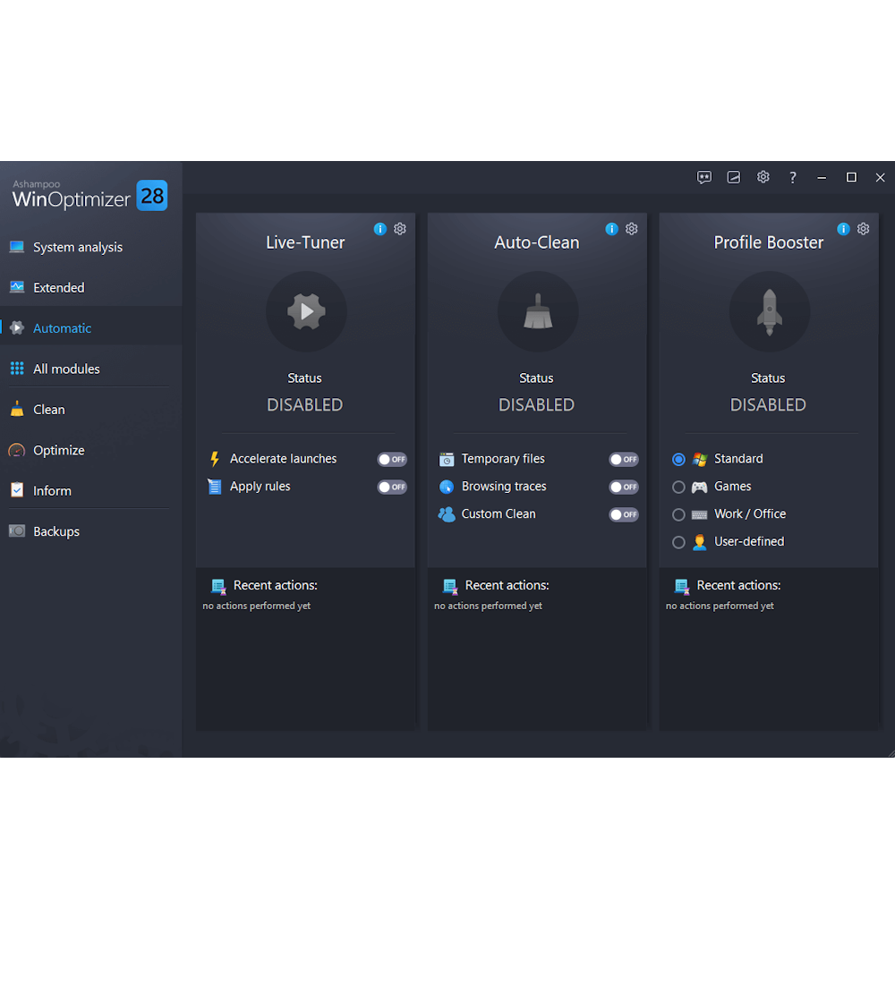 Con il nuovo Ashampoo WinOptimizer 28, ottieni automaticamente la migliore esperienza Windows. La sua nuova automazione accelera, pulisce e ottimizza le tue applicazioni. Fai in modo che il tuo PC si adatti perfettamente alle tue esigenze con l'assegnazione delle priorità ai processi, la pulizia automatica dei file temporanei e le configurazioni dei profili personalizzati basate sul nuovo Profile Booster. Che si tratti di giocare, lavorare o navigare, massimizza le prestazioni del tuo sistema o risparmia risorse, la scelta è tua. Il nuovo Crash Analyser offre approfondimenti sui crash del sistema e sulle relative cause, mentre quattro strumenti di pulizia avanzati garantiscono la privacy e forniscono la manutenzione del sistema. Grazie alla migliore gestione della memoria, WinOptimizer può ora utilizzare più risorse per eseguire analisi complete quasi istantaneamente!