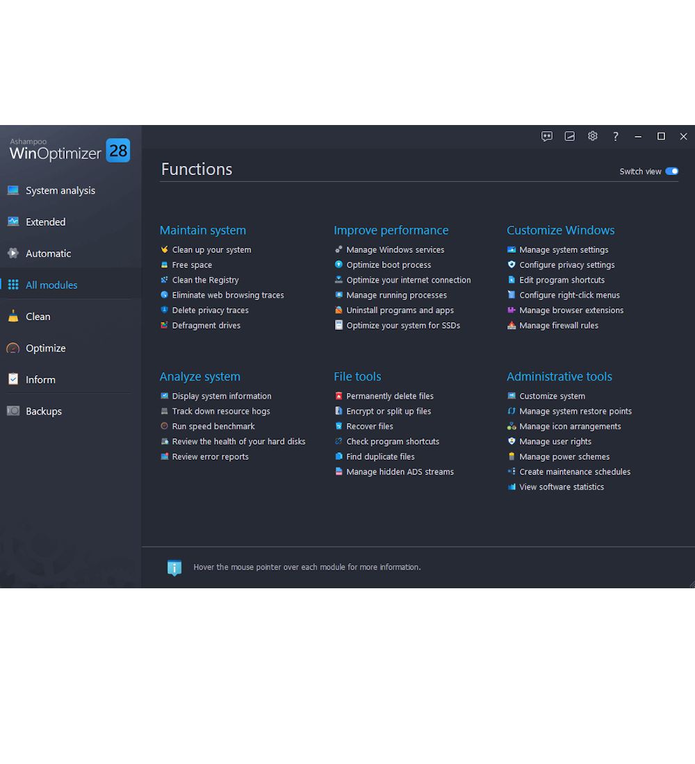 Più di 30 moduli di prim'ordine per ogni scopo — ben oltre la semplice pulizia e ottimizzazione.